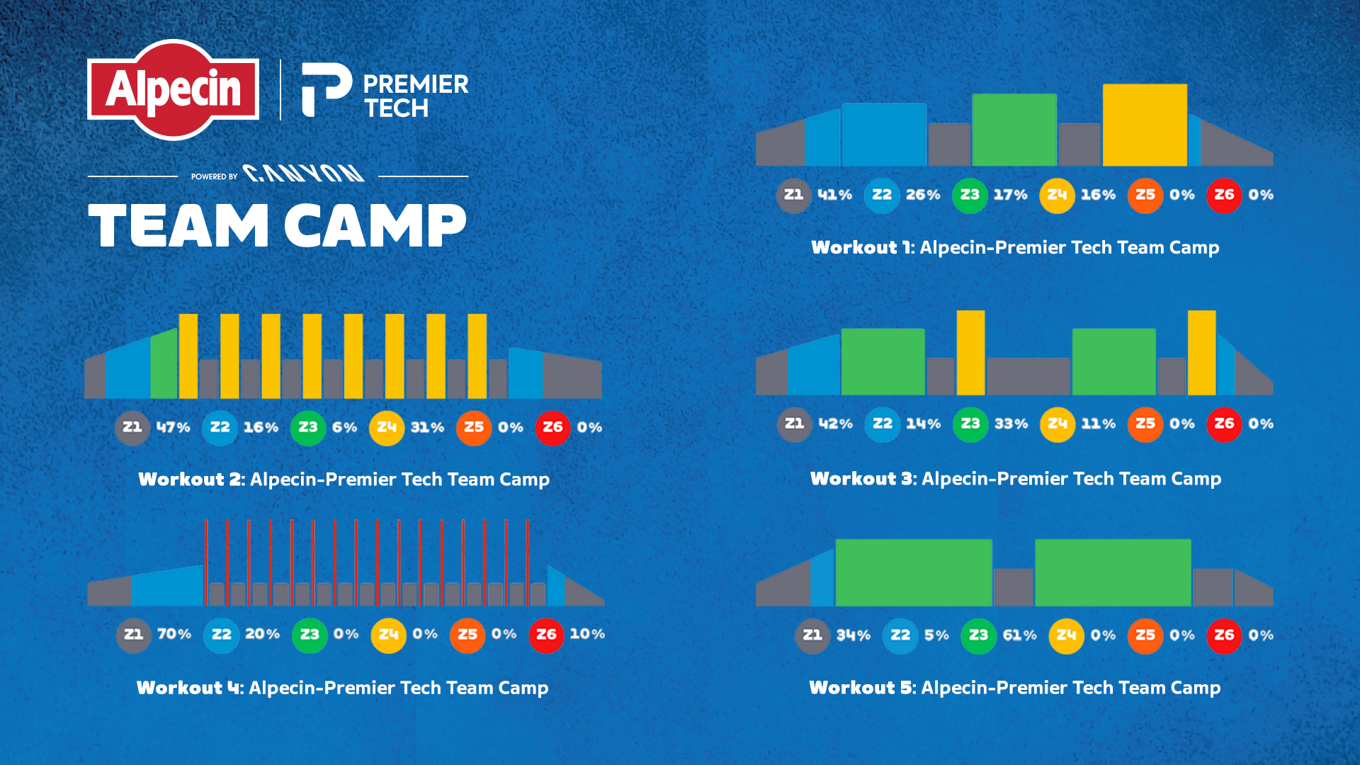The team camp consists of five serious workouts which each focus on a different element of cycling from endurance to strength and Vo2 Max. There will also be pro-led rides, where Zwifters can ride with members of Alpecin-Premier Tech including former Zwift Academy winners Luca Vergallito and Noah Ramsay, Kaden Groves, Jasper Philipsen and Mathieu van der Poel.